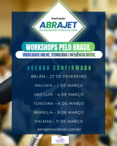 A Associação Brasileira de Jornalistas de Turismo inicia, a partir de fevereiro, o projeto nacional A Nova Rota do Jornalismo de Turismo – Visibilidade Online, Tecnologia e Influência Digital, uma iniciativa voltada à capacitação técnica e estratégica de jornalistas, comunicadores e gestores de portais de notícias, com ações presenciais nas capitais brasileiras.